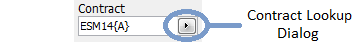 The underlying futures contract is entered in this field in order to access the options. Version 6.0 introduced the concept of the options "chain" to the application, allowing for support of various option types within the application. If no option type is requested explicitly, the platform defaults to American-style via the {A} notation as in the example at right. The Contract field allows for multiple delivery months and/or option types. For example, ES(Z14, H15){A} will display all American-style options that expire to ESZ14 and ESH15 respectively, while ESZ14{A, EF} will display all American-style and all European End of Month options expiring to the ESZ14 futures contract. More extensive information regarding use of the Contract field can be found here. The |