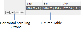 The Futures Table displays detailed quote information about the underlying futures contract in a fashion similar to the Quotes Monitor. Display columns may be added, removed and reordered via the Advanced Options Properties dialog. The dialog is opened with the Alt + P key combination and the column selection utility is under the Underlying Columns tab. Detailed information regarding these columns is available here. If the table contains more cells than the table display width will allow horizontal scroll buttons can be used to shift the displayed columns left or right ( |