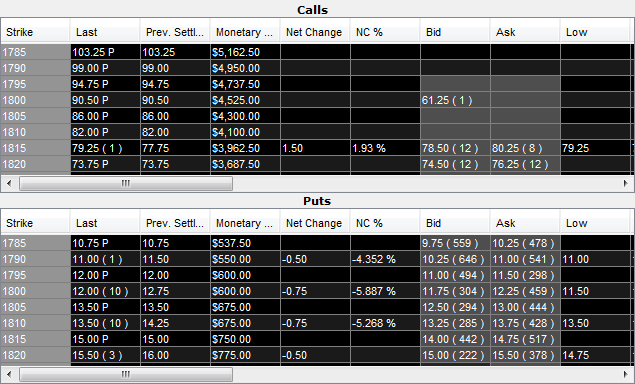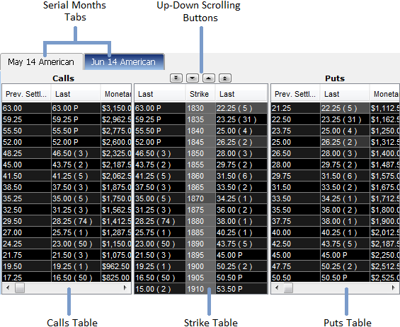 Some contracts may have multiple serial months attached to the same underlying futures contract. In this case, each month will have a separate tab with its Options Tables. By default, each tab is made up of 3 sub-tables: Calls, Puts and Strikes Table. The Calls/Puts Tables can be found on the left, and, respectively the right margins of the Options Table. The Calls and Puts tables can be displayed flanking the strikes, as described above, or in a Show Above/Below format wherein the Calls Table will appear above the Puts Table and the strikes will be listed on each. These Options Table display characteristics and can be configured from the Status Bar, discussed below. The Status Bar can also be used to choose to display only one of the tables, both or neither. Regardless of the settings, both tables will contain the exact same columns. Columns of the Puts/Calls Tables can be selected or removed from the Advanced Options Properties dialog (Alt + P on the keyboard) under the Options Columns tab. Detailed information about these columns is available here. The Strike Table contains the list of strikes available for the current serial month. Besides the central Strike column, additional columns may be added to the table. The columns can be mirrored to appear on either side of the market, making it easy to distinguish which data belongs to the Calls, and which belongs to the Puts. If the Show Above/Below display is chosen, this table will be hidden, and instead the Strike column will be added to both the Calls and the Puts Table (see the Status Bar section of this page). Columns of the Strike Table can be selected or removed from the Advanced Options Properties dialog (Alt + P on the keyboard) under the Fixed Columns tab. Detailed information about these columns is available here. The tables can be navigated via the scroll wheel on the mouse or by selecting a row then using the arrow keys on the keyboard. In addition to the scroll-wheel, the single-arrow ( |