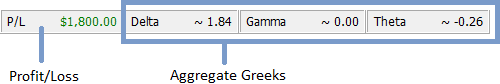 This bar allows a quick view of the Options Profit/Loss, as well as certain Aggregate Greeks values. The Delta cells will update based on the currently selection Greeks model, the positions held in futures contract and positions of options displayed on the tables. The Gamma and Theta cells will update based only on positions held in options displayed on the tables and the currently selected Greeks model. This model can be changed in the Advanced Options Properties dialog's Greeks tab. Note: If one trades on both sessions of a contract (Pit and Electronic) and needs to see the aggregate delta on both sessions, he has to open the Order Entry Properties dialog (F5), go to Actions & Properties tab and check the Allow pit and electronic to offset each other option in the Miscellaneous section. |