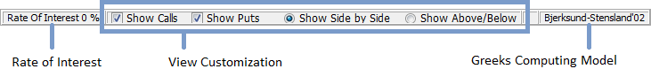 The middle section of the bar allows for configuration of the Options Tables display layout. Unchecking Show Calls, for example, will hide the Calls Table and expand the remaining two tables. Show Side by Side is the default display format, which will arrange the three Options Tables on the following order from left to right: Calls, Strike, Puts. Switching to the Show Above/Below option will arrange the Calls Table above the Puts Table and add the Strike column to both the Calls and the Puts Table (see at the image on the right). The same can be changed from the Advanced Options Properties dialog, Look tab, by selecting one of the Show Side by Side or Show Above/Below options. The display of the currently active Greeks Model is located in the lower right-hand corner of the frame. The default model varies from contract to contract. This model can be changed in the Advanced Options Properties dialog's Greeks tab. This same tab can be used to change any other setting that is related to Greeks for your Advanced Options frame. |