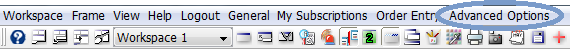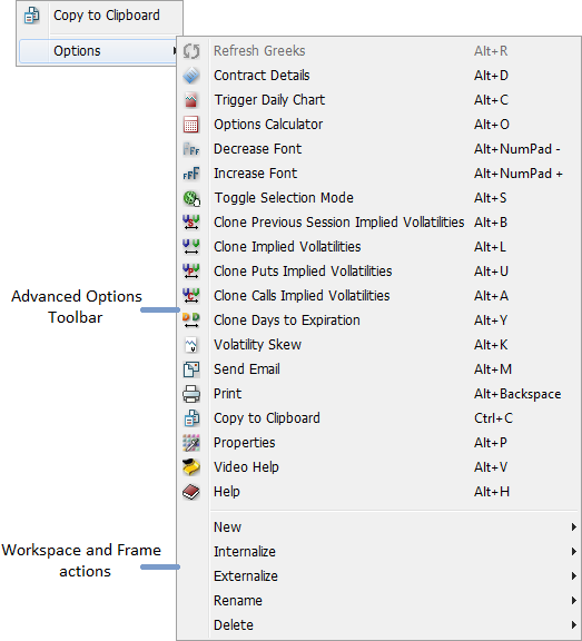 Please note that the Futures Table will always act as if in One-click Trading Mode, with the slight difference that a click on a cell that doesn't trigger Order Entry actions will display a slightly-modified, but similar popup to some we've seen that far (not shown here). At the bottom of the main Advanced Options pop-up menu (caption on the right side), there is a selection of menus that allow quick access to significant actions that concern existing or new Workspaces and Frames. |