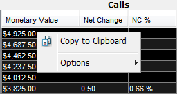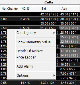 You can access the same operations and options from the Advanced Options Toolbar, as well as from the popup menu that is invoked if you right-click anywhere in an Advanced Options table - except a Last, Bid or Ask cell - and select Options (take a look at the image from the right). Back to the previously mentioned as exceptions, Bid, Ask and Last will trigger Order Entry-related actions (for details read the Order Entry section). The simpler menu that triggers the pop-up with Advanced Options actions also contains other items that will be presented below. Its content depends on the mode you are using (Selection or One-click Trading Mode) and the column you are clicking on.