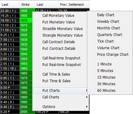 When you are in One-click-trading Mode and right-click the Strike column, a menu will appear. Take a look at the image on the right. Call/Put Monetary Value - Brings up a dialog that lists the monetary value of the currently selected strike's Call/Put. Also has buttons to place a Buy or Sell order for the current Call/Put. Straddle Monetary Value - If such a strategy is available on the exchange, brings up a dialog that lists the monetary value of the Straddle strategy for the current strike. Also has buttons to place a Buy or Sell order. Strangle Monetary Value - If such a strategy is available on the exchange, brings up a dialog that lists the monetary value of the Strangle strategy for the current strike. Also has buttons to place a Buy or Sell order. Call/Put Contract Details - Brings up a dialog with several useful pieces of information for the currently selected Call or Put, similar to the Contract Details dialog found in the Quotes Monitor frame. Call/Put Real-time Snapshot - Brings up a dialog showing a snapshot of the current Open, High, Low, Last, Net Change and Timestamp for the selected strike. Also has buttons to place a Buy or Sell order for the current Call/Put. Call/Put Time & Sales - Opens a Time & Sales frame for the current Call/Put, allowing you to follow a history of trades for the current Call/Put. You can change the settings of the Time & Sales frame that will be displayed from the Triggering tab of the Application Properties dialog. Call/Put Charts - Opens the Chart frame for the current Call/Put. You have a variety of options available for the resolution and type of the chart you want to open (please see the screenshot on the right). You can change the settings of the Chart frame that will be displayed from the Triggering tab of the Application Properties dialog. |