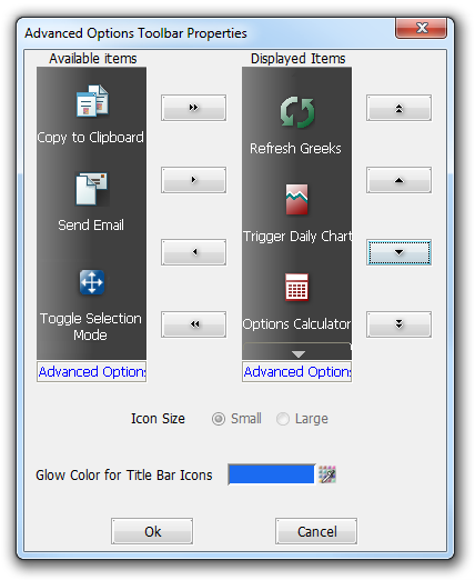 From the Advanced Options Toolbar Properties you can add, remove and reorder the displayed items on your Advanced Options Toolbar. The Icon Size depends on the size of the buttons used for the main Application Toolbar. In order to read about how to change this size, please click here. You can also change the icons' glow color by pressing the By the Available Items' list right side (containing elements not shown on your toolbar) there are 4 buttons which enable you to: