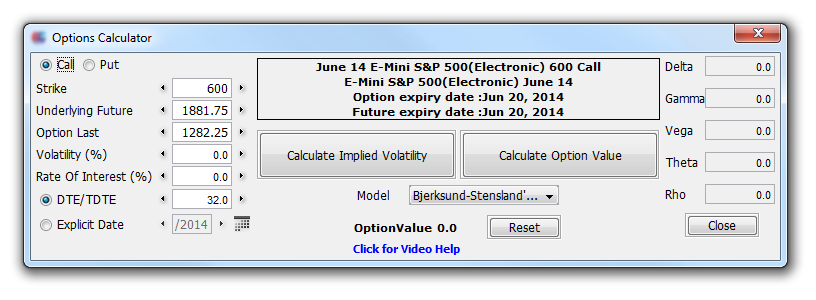 Options CalculatorYou can use the Options Calculator to quickly determine the Call/Put Implied Volatility and Option Value for a given Strike, so you don't have to browse the table and search for a specific row. All the factors used in calculating the Volatility or Options Value can be manually altered here, allowing you to experiment with different settings, which are separate (won't interfere with those) from the main table: Strike, Underlying Future value, Option Last trade value, Volatility (%), Rate Of Interest (%), Days or Trading Days Until Expiration (DTE/TDTE) or Explicit Date.