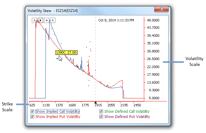 If you have checked the Take snapshots of options data option in the Advanced Options Properties dialog, Volatility Skew tab, then you can also "play a movie" with the volatility's evolution.