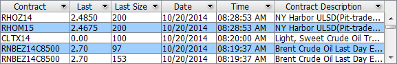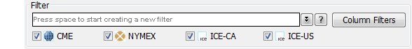 The section where you can customize trades shown in the Trades Table below, through filter definitions. By "filters", we understand both the Filter Text Field, as well as the checkboxes designated for each Exchange. (Regarding the latter, it is worth mentioning that the selection of Exchanges is limited to those that support block trades and are provisioned for real-time access by your subscription.) This being said, we will focus on the Filter Text Field. This field allows users, especially those familiar with filtering formulas, to enter such constructions directly (by simply typing them in, then pressing Enter to have them take effect). A simple example would be typing a contract – e.g. NCUZ14 – and pressing Enter. However, as we will see in the following, filters can be much more elaborated. In order to enable the auto-complete function for the formulas in the Filter Text Field, go to Application Properties, Layout and Organization tab and make sure the Enable autocomplete for filters option from the Editors section is checked. The double-arrow button Most users will be better served by using the Column Filters button. In order to read more about Filters, please click here. |